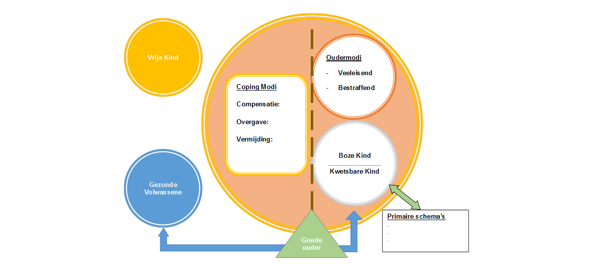 Een groot voordeel van Schematherapie is de taal die zowel theoretisch als in het contact met cliënten gebruikt wordt. De modi en schema’s zijn heel herkenbaar voor mensen en zo is deze methodiek voor veel mensen toegankelijk een breed toepasbaar. Het model ziet er als volgt uit: